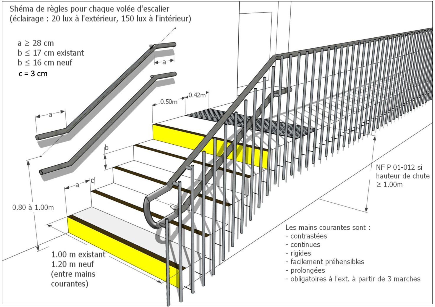 - Éclairage ≥ 20 lux pour les escaliers extérieurs et ≥ 150 lux pour un escalier intérieur